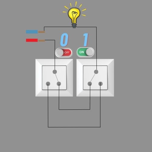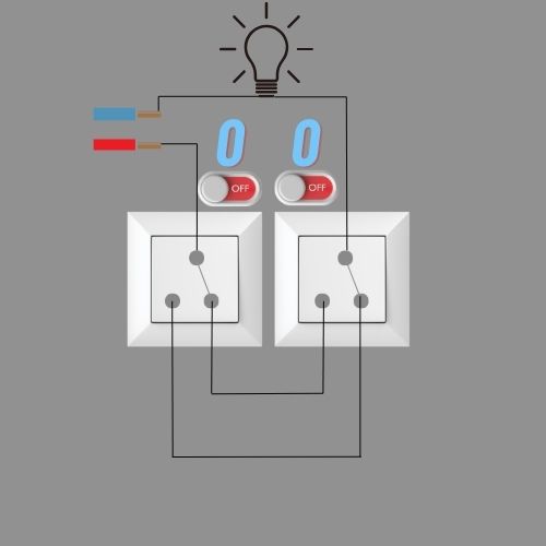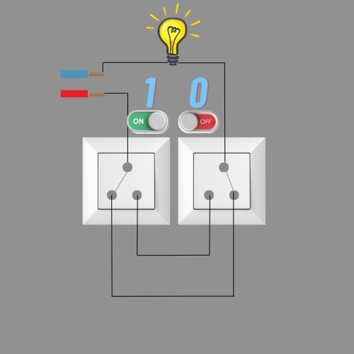 Yukarıdaki şekilde vavien anahtarların eşitlilik durumunda (0-0 veya 1-1) devrenin nasıl tamamlanmadığını ve lambanın yanmadığı görülmektedir.