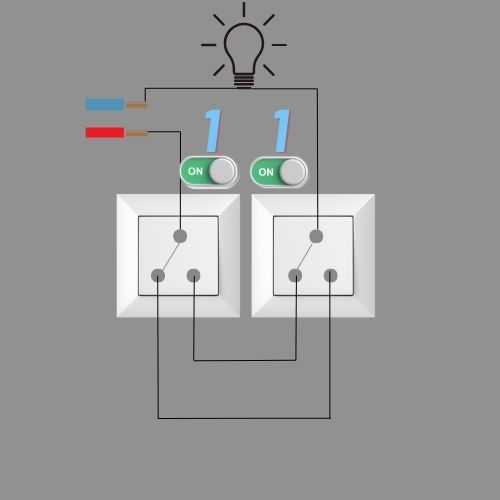 Yukarıda ki şemada kapalı durumdaki iki vavien anahtarın bağlantı şeması gösterilmektedir.Kırmızı kablo faz,mavi kablo ise nötrdür.Fazdan, ilk vavien anahtarın üst ucuna bağlantı yapıyoruz.Alt bağlantı uçlarında dıştakileri ve içtekileri birbirine bağlıyoruz.İkinci vavien anahtarın üst ucunu ise lambanın diğer ucuna bağlıyoruz.